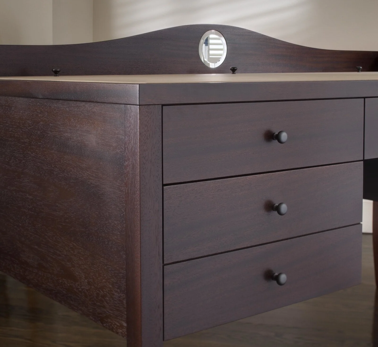 The Paris Writing Desk is an expanded version of the original Paris Writing Table, offering the functional features of drawer pedestals, hidden wire management, and file storage. Finished with a generous leather top and useful lidded compartments, the Paris Writing Desk is elegantly efficient, modern, and refined.