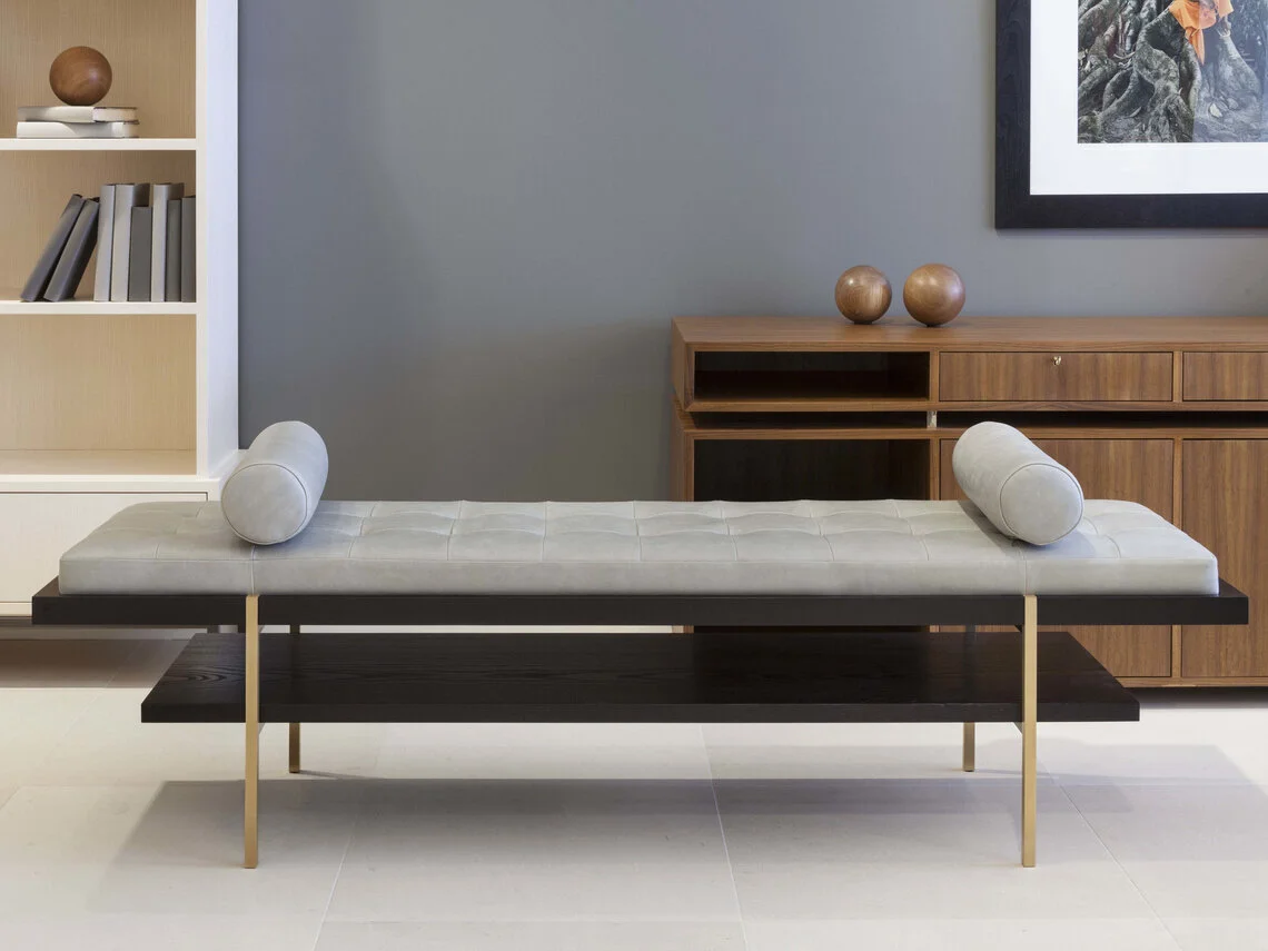 The City Bench is a double-duty piece that also knows how to be a table. Supported by slender stainless steel or bronze legs, the generous upper shelf is upholstered with buttonless biscuit tufting and a pair of discreet bolsters for a comfortable perch. A second shelf is at the ready for a book or two, a box of photos, or a pair of shoes.