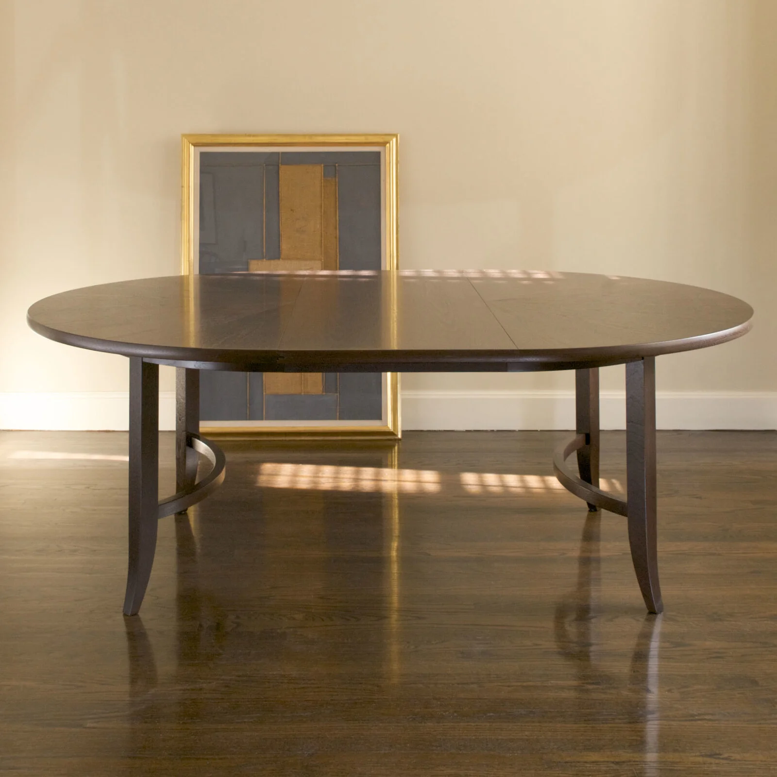 There is no furniture piece more human than a table; tables connect us to each other and connect us to a larger space. They allow us to display treasured objects, set out food, or engage in conversation. The Avignon Dining Table is a refined and beautiful round table made of solid walnut with a sunburst veneer top and an extension feature for larger groups. Its unique stretcher base is designed so that the appearance of the table remains as attractive when opened as when closed.